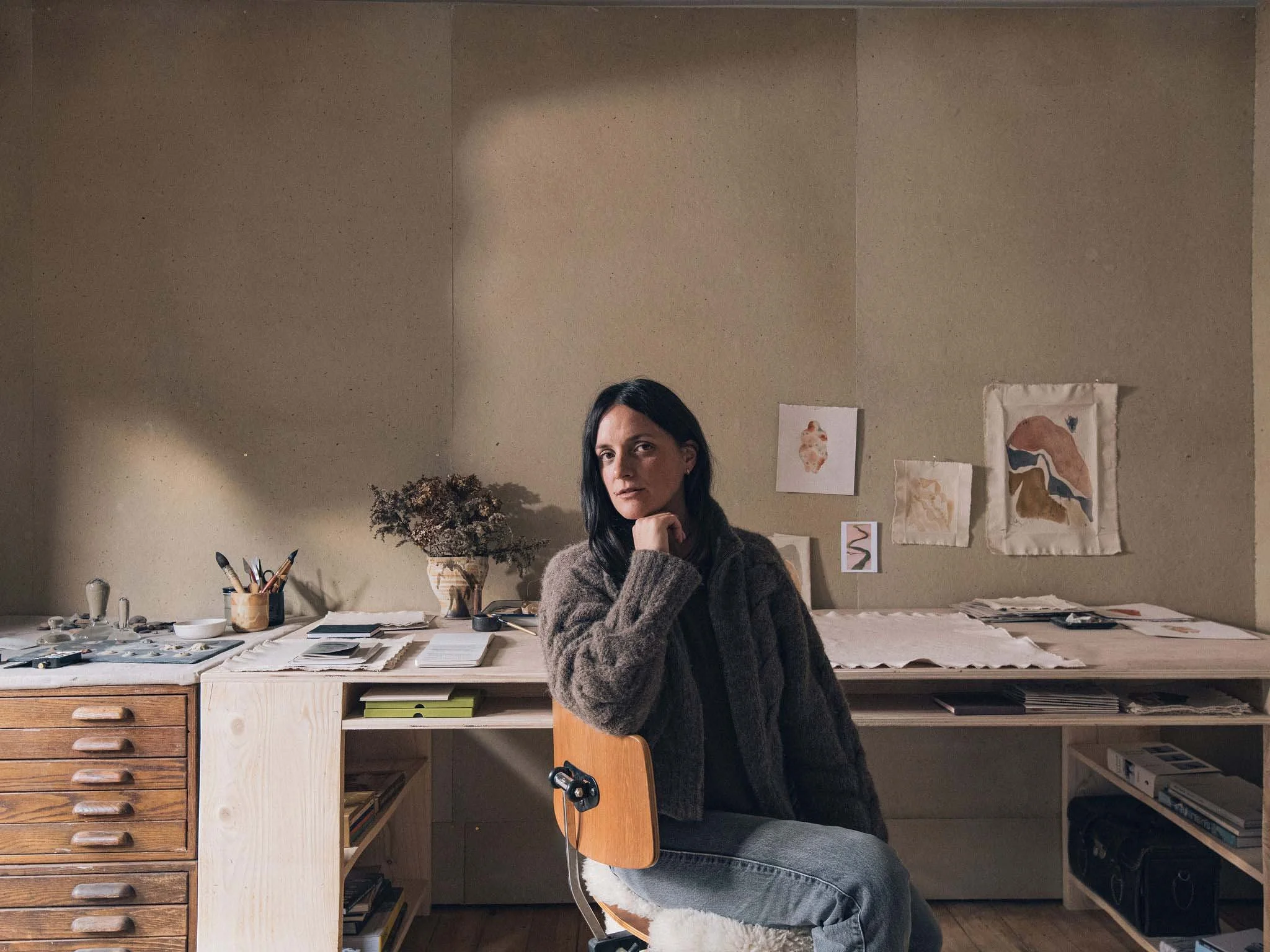 The artist has just returned from Rome. There, she spent a week transforming stones, dirt, and minerals into pigments, using methods humans have practiced for thousands of years. On the table, I notice a palette carved from found Italian cypress wood, each of its wells filled with a different delicate tone. Beside that, there’s a series of pens and brushes made from swan and goose feathers. Johnston shows me a notebook filled with daily drawings done with these pigments, some abstract and some depicting landscapes. I look up from the table and let my eyes rest on the walls, hung with Johnston’s newest body of paintings: shapes that are alive with warmth and strangeness dance over raw canvas and sheets of hemp paper. Then my eyes move to the window, to the mountains and sky, the sound of the river, and the continuity becomes clear.